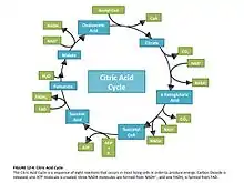 The citric acid cycle, also called the Krebs cycle, is the final stage of the oxidation of glucose. The carbon atoms enter the cycle as acetyl-CoA formed in the previous step (decarboxylation of pyruvate) and are oxidized in mitochondrial eight reactions to form various compounds such as CO2 and various hydrogens which are then captured by the NAD and FAD, produzind to three molecules of NADH and FADH2, and ATP release. These molecules formed during the Krebs cycle (NADH and FADH2) are acceptors H (receptors) intermediates of hydrogen which bind to protons (H +), released during the stages of metabolism of glucose, giving them for oxygen, which is acceptor (receiver) end of hydrogens.