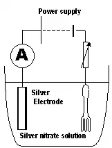 A student decided to silver plate his/her mother's forks. S/he set up the apparatus above. S/he set the power pack and variable resistor so that the ammeter read 0.1 A. S/he allowed the fork to remain in the electrolysis apparatus for 10 min. Once s/he removed the fork s/he tested it by trying to scratch the silver off. S/he found that the layer of silver was too thin and decided that s/he would have to take steps to make the layer a lot thicker.