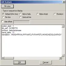 This tab shows a list of all features of the sequence. Features can be added, edited, and deleted. Most of the settings should be self-explanatory.