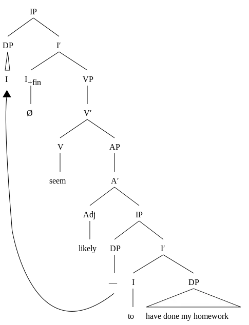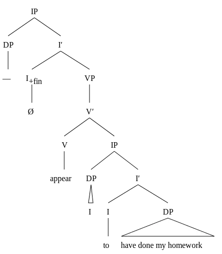 (6a) D-structure of (5a): — appear I to have done my homework (6b) S-structure of (6a): I appear — to have done my homework