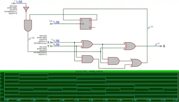 A serial adder is a kind of ALU that calculates each bit of the output, one at a time, re-using one full adder (total). This image shows a 2-bit serial adder, and the associated waveforms.