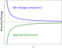 It is often more convenient to discuss intermolecular forces in terms of the potential energy of the interaction. The potential energy of the interaction of two charged particles, labelled A and B, can be determined by integrating the force experienced between the particles if they were moved from infinite separation where the intermolecular interaction is zero, to the distance () they are actually separated by,