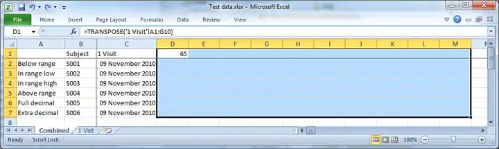 3. Your formula should look like this: '=TRANSPOSE('1 Visit'!A1:G10)'