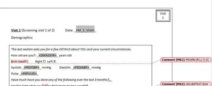 2. The Word merge also produces a marked-up CRF with code lists for data analysis