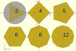 These result in the following shapes, where the polygon is inscribed within the circle with all sides (and angles) equal. One corner points to the positive x direction. For irregular shapes see the polygon primitive below.