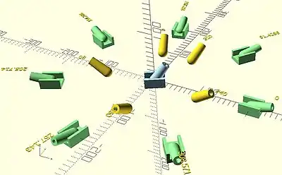 color("blue") { translate([5,3,0]) sphere(5); rotate([45,0,45]) { cylinder(10); cube([5,6,7]); } }