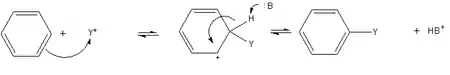 At the next stage the σ-complex decomposes, freeing a hydrogen cation and forming the product of substitution.