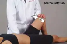| Internal rotation | Flex the hip and flex the knee while internally rotating the hip to its barrier | ![]() Spencer's technique of the hip - internal rotation |