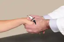 A. The physician contacts the proximal radial head and rotates the forearm until into supination until the restrictive barrier is reached. The physician carries the forearm into slight extension and supination while maintaining thumb pressure over the anterior radial head.