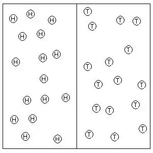 Students can imagine that every time they toss a coin, they need to place that coin into the appropriate side of the rectangle. As the number of throws increases, the amount of area needed to enclose the coins will be the same on both sides. The same probability can be shown using a tree diagram:
