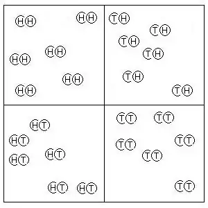 In the above area rectangle the instances where heads has been tossed twice in a row is represented in the upper left hand corner. Note that whereas the probability of tossing both heads and tails (in any order) is 50% or 1/2, and the probability of tossing two heads in a row is 25% or 1/4.