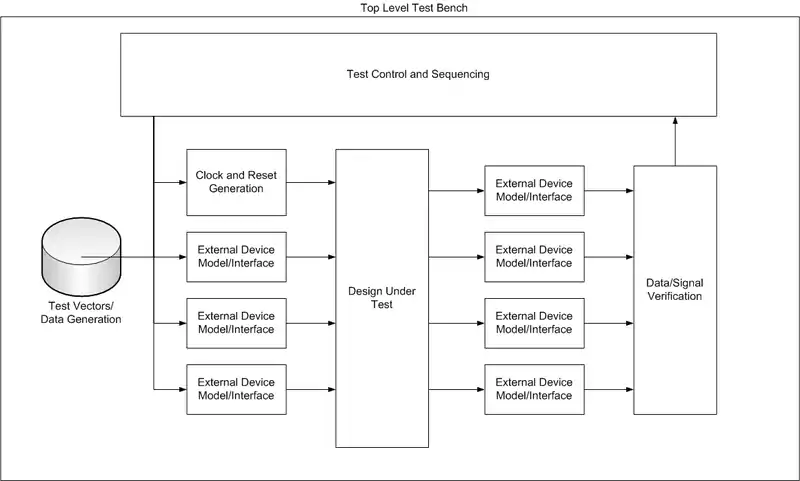 In this design, the “testbench” itself is merely a module without any external interfaces that instantiates the many modules that make up the modules that do the actual testing. The wrapper testbench and all the testing modules that make up the test bench (everything except the design to be tested) are often collectively referred to as a testbench. Often instantiated in a test bench wrapper is the design to be tested, external interface models, test data generators, signal verification modules, and a control module that controls the external interface modules and reports information to the user.