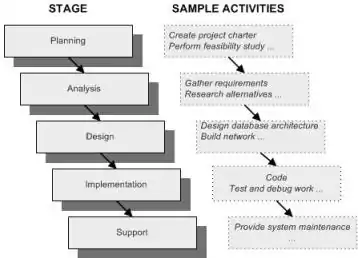 In IT projects, work from concept phase to deployment and maintenance of a system is typically organized by the System Development Lifecycle (SDLC). The SDLC categorizes the type of work that is done at each stage of product development or enhancement. In the most traditional way of structuring project activities, work is sequentially performed via the waterfall method, where the next phase of activities does not commence until work from the previous phase is complete and approved (see Figure 1). This approach to the SDLC is implemented best in scenarios where the requirements for the new system is relatively stable and probability of project risk is fairly low (i.e. new technology is not being implemented). On the other hand, when requirements are likely to change often, or need prototyping for discovery or proof-of-concept, developers will modify the SDLC and iterate through phases in a spiral-like fashion - completing several rounds of planning, analysis, design, implementation etc. until the product evolves into a fully functioning system.