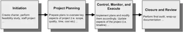 What is important to note about the SDLC is that it is specific to the IT industry and is focused on product development. However, there is another way of understanding the lifecycle of a project, which is discipline independent. Furthermore, one can conceptualize the lifecycle of a project from a process orientation. Seen from this perspective, the lifecycle is used to manage the inputs and outputs of the project, which define its overall structure and control. For example, refer to Figure 2.