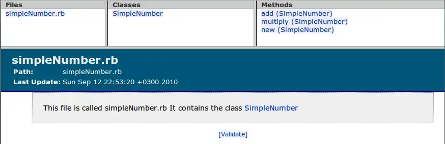 - RDoc documentation (generated using RDoc!) at Ruby-Doc