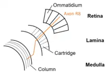 The lamina is organized into radially distinct areas, called cartridges. The curvature of the compound eye causes the outer photoreceptor cells R1 - R6 to perceive information about different spatial locations. To account for this phenomenon and to increase sensitivity, the photoreceptor cells R1 - R6 from different, neighbouring ommatidia are guided to the same one cartridge within the lamina. This allows to maintain retinotopy. This process is called neural superposition. R7 and R8 do not share the problem of retinotopy, as they are located in the centre of the ommatidium. The photoreceptor cells R1 – R6 terminate in the lamina and connect to the lamina neurons by formation of synapses. Those lamina neurons forward the information into the medulla. R7 and R8 do not form synapses in the lamina and further project into the medulla.