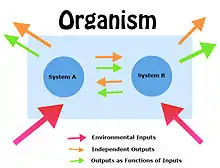 In the figure above, for simplicity, interacting physiological systems are shown as two separate systems. They are affected by inputs from the environment and from other systems. For example, the mortality of an organism increases as the various outputs of its systems diminish over time due to the aging of the organism. Damage to the organism can also cause dysfunction which can result in inappropriate system outputs.