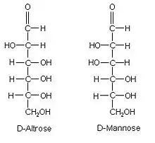 A second type of isomer seen in carbohydrates are diastereoisomers. Carbohydrates are classified as diastereomers if their chiral carbons are connected to the exactly the same substrates but connected at differing configurations (R or S). Unlike an enantiomer, diastereomers are NOT object and mirror image. An example of two carbohydrates that are diastereoisomers are D-Glucose and D-Altrose as seen in the figure to the left.