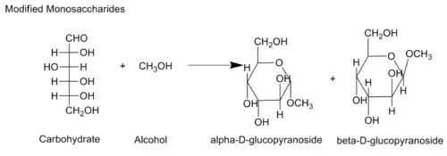 A Haworth projection is a simple way to show cyclic sugars and their glycosidic linkages. It consists of the ring on a horizontal plane but ignores the chair and boat forms so that the ring is flat. If drawn from a Fischer projection with the carbonyl on top, the groups on the right side become the groups on the bottom of the ring and the groups on the left become the groups on the top. The carbon at the very bottom of the Fischer projection is placed on top of the ring by default (if it is not a part of the ring itself). An α-linkage occurs when the hydroxyl of the hemiacetal is on the bottom of the right and a β-linkage occurs when the hydroxyl is on top.