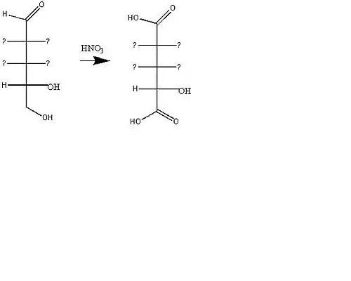By adding the HNO¬¬3 to arabinose, arabinose will be oxidized into an optically active aldaric acid. Out of the four possible aldaric acid derivatives from a set R penultimate configuration, two were eliminated because they were not optically active. The two remaining candidates’ C2 have the same S stereocenter configuration.