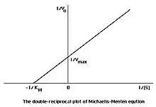 A graph of the double-reciprocal equation is also called a Lineweaver-Burk, 1/Vo vs 1/[S]. The y-intercept is 1/Vmax; the x-intercept is -1/KM; and the slope is KM/Vmax. Lineweaver-Burk graphs are particularly useful for analyzing how enzyme kinematics change in the presence of inhibitors, competitive, non-competitive, or a mixture of the two.
