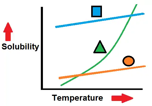 The blue square is soluble at all temperatures, The orange circle is mostly insoluble at all temperatures, and the green triangle is soluble at high temperatures and insoluble at low temperatures.