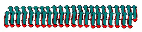 From X-ray crystallography, three-dimensional crystals of amyloid fibril structures were formed and the structure of the peptide formation and how the molecule is packed together were examined. In one particular fragment, the crystal was found to contain parts of parallel β-sheets where each peptide contributes one single β-strand. The β-strands are stacked and β-sheets formed are parallel and side chains Asn2, Gln4 and Asn6 interact with each other in a way that water is kept out of the area in between the two β-sheets with the rest of the side chains on the outside are hydrated and further away from the next β-sheet.