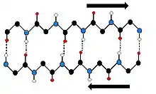 The anti-parallel configuration is the simplest. The N and C terminals of adjacent polypeptide strands are opposite to one another, meaning the N terminal of one peptide chain is aligned with the C terminal of an adjacent chain. In the anti-parallel configuration, each amino acid is bonded linearly to an amino acid in the adjacent chain.