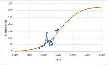 Fig. 1b Evolution of total miles of track of electric streetcars systems in Delaware over the range of the modelled logistic function