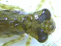 Green Darners belong to one of the biggest dragonfly species. They range in size from 2-3/4 inches to 3-1/8 inches. The wingspan can be up to 4-3/8 inches. They are dark greenish-brown with green thorax and blue to purplish-gray abdomen. Their pale wings have pale yellow tips. Green darners have a target-like mark on the face. Naiads can be as long as 1-7/8 inches.