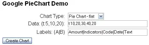 http://chart.apis.google.com/chart? cht=p &chd=t:10,20,30,40,20 &chl=Amount|Indicator|Code|Date|Text &chs=400x300