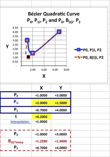 - Enter t to cell A34; enter X P0 to cell B34; enter Y P0 to cell C34; enter X P1 to cell D34; enter Y P1 to cell E39; enter X P2 to cell F34; enter Y P2 to cell G34; enter ((1-t)^2+(1-t)t*P1+t^2* P2)*Interpolater to cell K39 and also to cell L39;