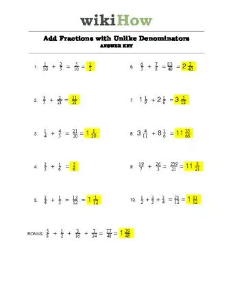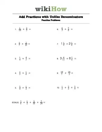 Adding fractions with unlike denominators may look tricky, but once you make the denominators the same, addition is a snap. If you're working with improper fractions where the numerators are larger than the denominators, make the denominators the same. Then add the numerators. If you're adding mixed numbers, turn them into improper fractions and make each fraction equivalent. This will make it easy to add the fractions together.
