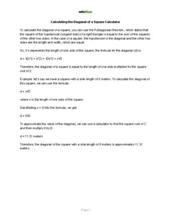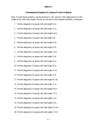 To calculate a diagonal of a square, multiply the length of one of the square's sides by the square root of 2. If you don't know the length of one side, you can find it by plugging the square's perimeter into the formula: perimeter = 4s, where s is the length of one side. If you don't know the perimeter, you can still find the length of one side by plugging the square's area into the formula: area = s^2, where s is the length of one side. For help solving these formulas, keep reading!