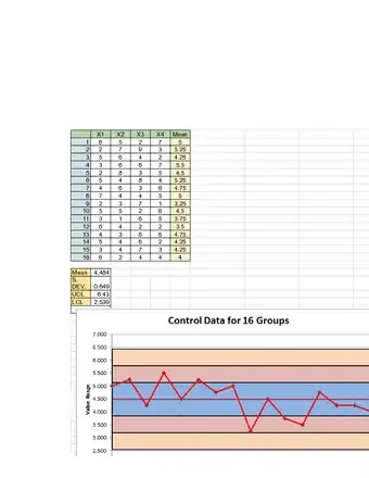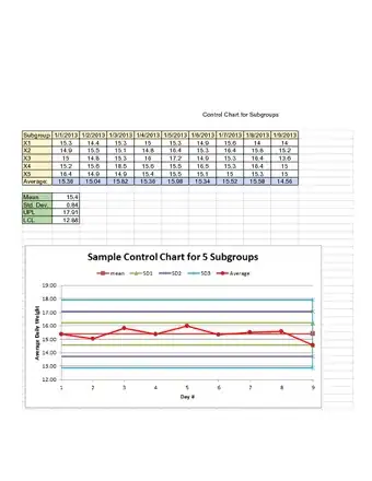 8Graph the X-bar Control Chart, by graphing the subgroup means (x-axis) verses measurements (y-axis).[5] Your graph should look like something like this: