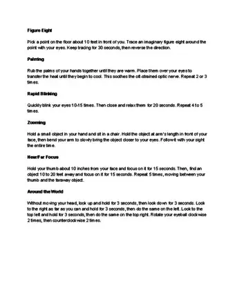 To exercise your eyes, hold your thumb in front of your face and focus on it as you slowly move it further away. You can also exercise your eyes by staring 1 feet in front of you and tracing a figure 8 with your eyes. Also, try staring straight ahead and looking down, up, and to both sides without moving your head. When you're finished with your eye exercises, gently press your palms into your eyes, which will reduce stimuli and help your eyes relax. For more tips form our eye doctor reviewer, including how to massage your eyes to improve blood circulation, read on!