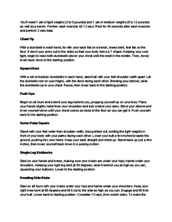 2Do t-planks. This exercise will help to stretch out your chest and build muscle, while also toning your arms. You will need a set of 5 to 10 pound dumbbells. To perform this exercise correctly: