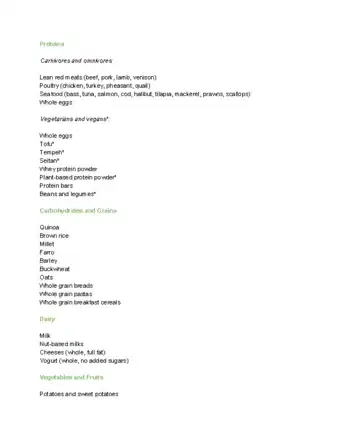 - Good sources of protein include lean meat, fish and poultry, in addition to eggs, whole grains, dairy products and legumes. You should aim to eat about 5 oz of protein per day, from a combination of these sources.