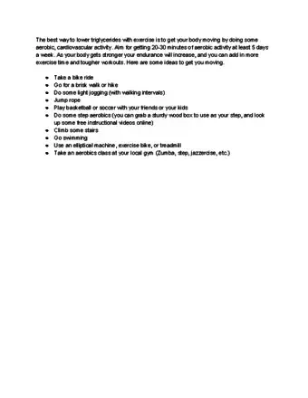 - Resist the temptation to set a rigorous exercise regimen. You may think that starting out with a challenging exercise program will lower your triglycerides quicker, but this is a bad move in the long run. Starting with something too difficult increases the likelihood of you quitting the program sooner. Begin by introducing 10 minutes of exercise into your daily routine, adding a minute or two every week until you can comfortably reach 30 to 40 minutes per day. However, aim for at least 150 minutes per week.