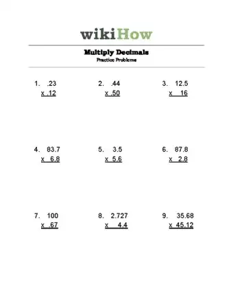 Multiplying decimals may look tricky, but it's quite simple if you know how to multiply whole numbers. You can multiply numbers with decimals just as you would multiply whole numbers, as long as you remember to factor in the decimals at the end of the problem.[1] So how do you do it? Follow these steps to find out.