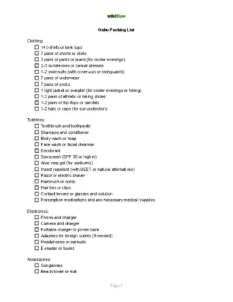 If you’re planning a two-week trip to Oahu, Hawaii, you’ll want to make sure to pack everything you need efficiently. Look at your itinerary for clues on what to bring, like hiking gear, bathing suits, or formal wear. You’ll also want to think about the climate, which stays warm year-round. Consider packing 5 to 6 casual t-shirts and tank tops, 3 to 4 pairs of shorts, 1 pair of jeans, 2 casual shirts, 2 to 3 bathing suits, 2 suit cover-ups, 2 to 3 sundresses or skirts or pairs of slacks, 1 nice outfit, 3 pairs of pajamas, 6 pairs of socks, 6 pairs of underwear, and 2 to 3 active outfits. You’ll also want to pack a pair of training shoes, 1 pair of flip flops, and 1 pair of dress shoes. To learn what toiletries to pack, keep reading!