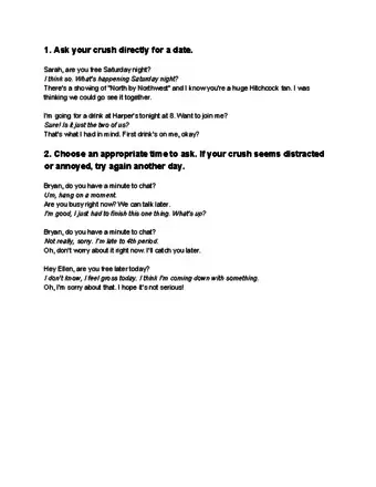8Ask for a date. If you feel like the conversation is going well, don't hesitate to ask when your crush is free again. This can be anything from a couple of minutes at lunch tomorrow to a bona fide date with movie and dinner — your request will depend on how confident you feel and how your crush acts while you're talking.
