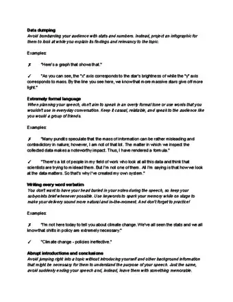 • Try to avoid pounding your audience with long series of numbers or statistics – they typically won't retain the information. If you have a significant amount of numerical data or statistics, creating an infographic you can project during your presentation may be more useful.