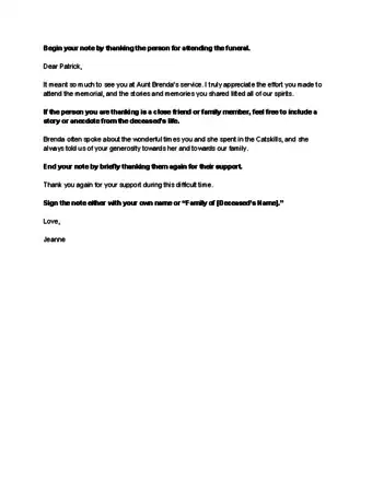 To write a thank you note to someone after a funeral, write a few sentences thanking them for thinking of you during this hard time and letting them know it meant a lot to you. If you're close to the person, you could include an anecdote or story from the deceased's life to make the note more personal. It's also nice if you mention what the person contributed after your loss, whether it was flowers, food, or a donation. For more advice, like how to prepare and send your thank you notes, keep reading.