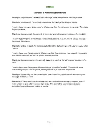 An acknowledgement email lets another person know that you received a message or request, even if you aren’t able to give a full response right away. While you don’t need to send an acknowledgement for every personal email you receive, you should respond in a professional or business setting when you’re addressed directly. If you only need to tell the other person you received their email, send a short acknowledgement to let them know. If the person requested a service or ordered a product, provide more information about when to expect a reply or how to resolve any issues.