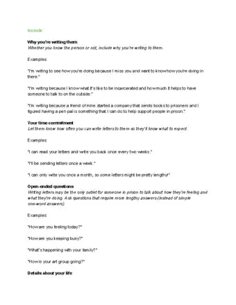 Be clear in your intentions. When you write an incarcerated individual, it is important to be clear about your reasons for writing the letter. If you are looking for friendship or to offer support you should state this in your letter. You should also state how often you will be able to correspond to the prisoner.