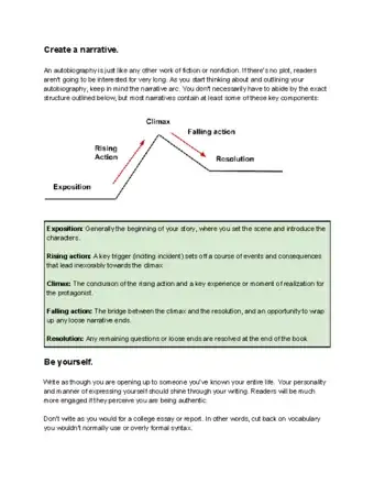 1Create an overarching plot. Now that you know what content you want to include in your autobiography, think about how you want to structure your book. Like any great book, your autobiography needs a great plot. Work with the material you have to craft an interesting story that builds toward a climax and ultimately resolves. Create a narrative arc[3] by organizing and filling out your written memories and anecdotes so that they flow together logically.