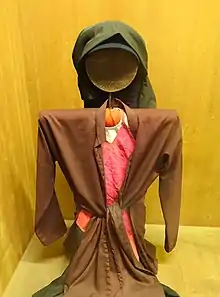 - A flowing outer tunic, reaching almost to the floor. It is open at the front, like a jacket. At the waist the tunic splits into two flaps: a full flap in the back (made up of two flaps sewn together) and the two flaps in the front which are not sewn together but can be tied together or left dangling.