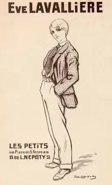 45 year old Lavallière as a schoolboy in her garçonne haircut, drawing by Daniel de Losques (1912)