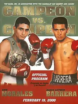 Erik Morales vs. Marco Antonio Barrera, billed as Campeón vs. Campeón, was a professional boxing bout between the WBO super bantamweight champion Marco Antonio Barrera and WBC super bantamweight champion Erik Morales. It took place on February 19, 2000, at the Mandalay Bay Resort & Casino in Las Vegas, Nevada. Morales won the contest by split decision, with two judges scoring it 114-113 and 115-112 for Morales and the other scoring it 114-113 for Barrera. The fight was named The Ring Magazine 2000 Fight of the Year and has been regarded as the best fight ever by many.
